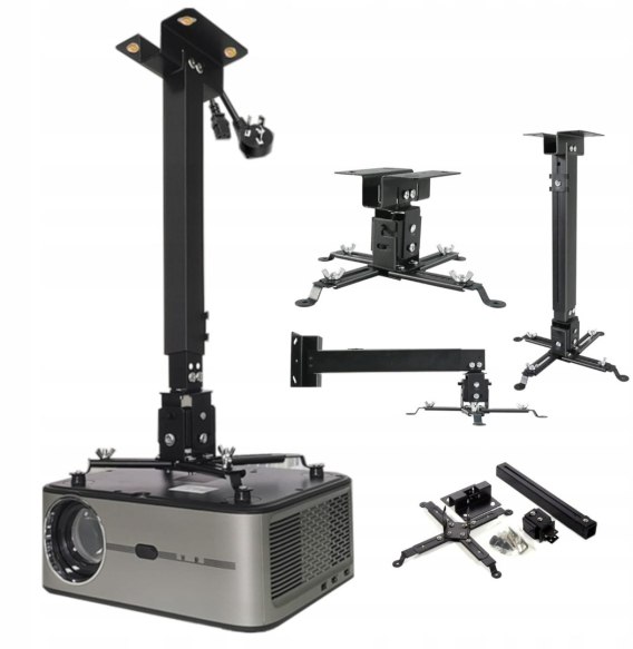 • W komplecie akcesoria montażowe: wszystkie narzędzia do montażu, wiele rodzajów śrub pasujących do wszystkich projektorów, kołki rozporowe. Jedyne co musisz zrobić we własnym zakresie to wywiercić otwory w ścianie lub suficie pod uchwyt.